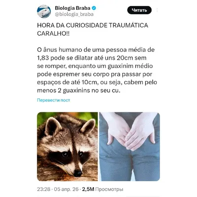 😨Анус обычного человека ростом 1,83 м может растягиваться до 20 см без разрыва — об этом заявил бразильский научпоп журнал. Также в материале упоминается, что еноты способны сжимать тело и проходить