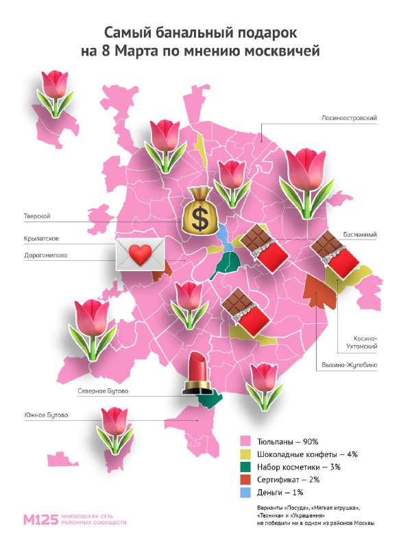 Тюльпаны, шоколадные конфеты и косметика — москвичи выбрали самый банальный подарок на 8 Марта В новом мосопросе спросили у жителей и жительниц Москвы, какой подарок на 8 Марта они считают самым заур