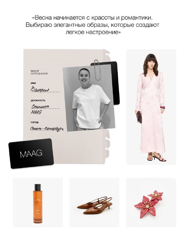 Весна — время обновлений Команда MAAG собрала вещи, которые станут отличной базой для весеннего гардероба – на каждый день и для особенных поводов. Выбор Валерии: ▫️Платье из жаккарда ▫️Парфюмерная