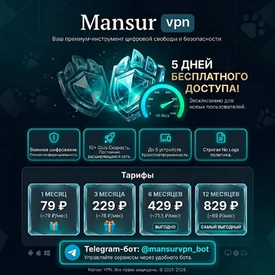🚨 5 ДНЕЙ MANSUR VPN БЕСПЛАТНО 🚨 Блокировки приходят внезапно. И самое обидное, когда интернет пропадает у тех, кто рядом с тобой. Mansur VPN — работает там, где другие сдаются. Маскирует трафик, о
