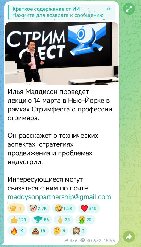 Илья Мэддисон про культуру стриминга. Лекция в Нью-Йорке в рамках Стримфеста вышла запись лекции https://youtube.com/watch?v=OlA3b-6tMOk
