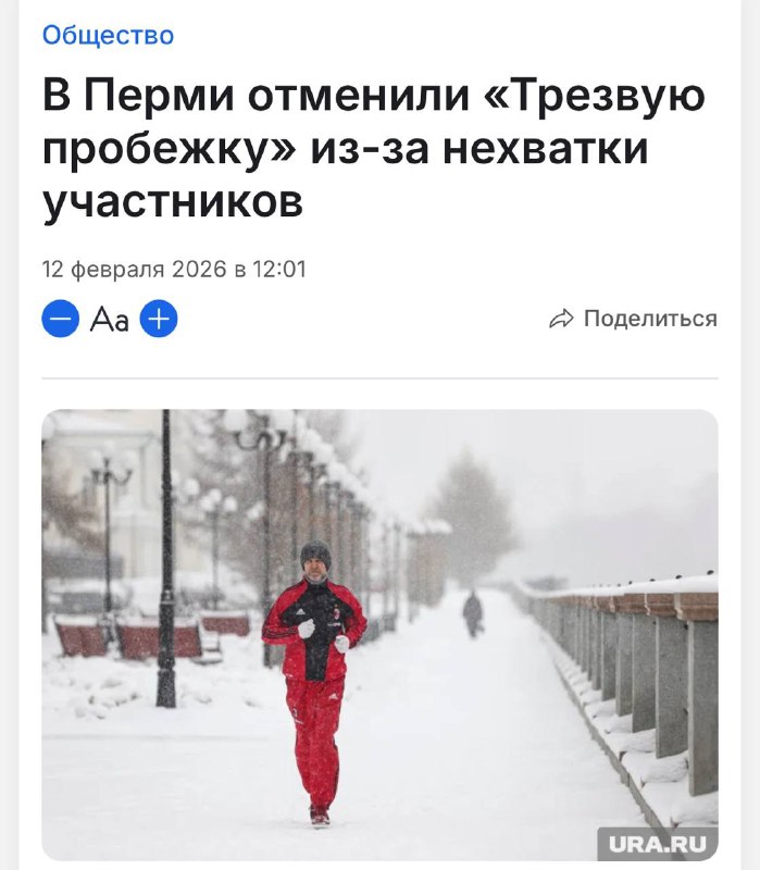 😃Мем дня: в Перми отменили «Трезвую пробежку» из-за того, что… никто не пришел. Акция проводилась с 2012 года, но в этот раз собрать нужное число заявок не удалось.