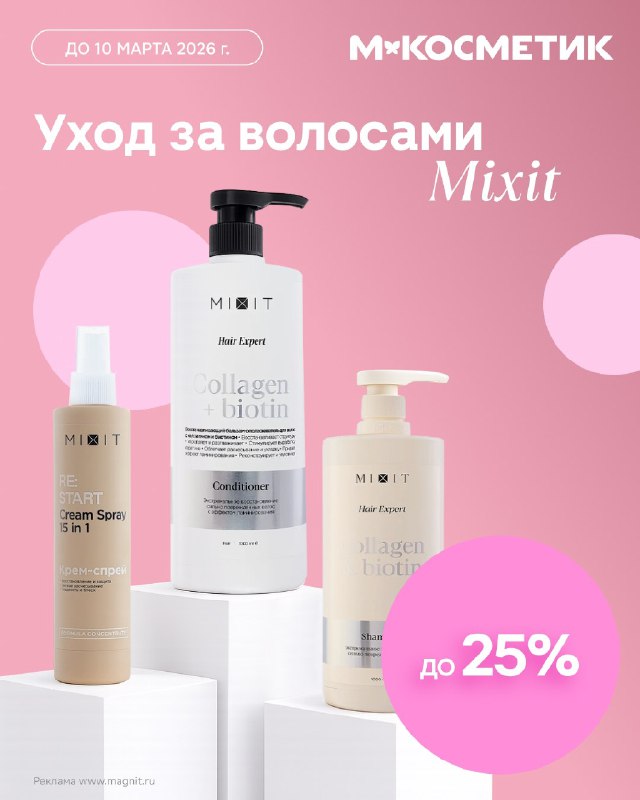 Магнит Косметик Скидка до 25% на уход для волос от Mixit Коллаген и биотин в одной линейке — это серьёзно. А как иначе, когда каждый день нужно бороться с пористыми, ломкими и непослушными волосам
