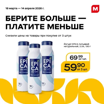 Закупайтесь впрок в Магните 🛒 Мы знаем, как сильно вы любите йогурты EPICA, поэтому включили их в новый сезон выгодной закупки. До 14 апреля покупайте любимый перекус по выгодной цене: 🛍 Питьевой