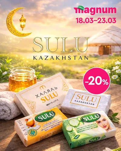Қасиетті Ораза Айт және Наурыз мерекесіне орай жағымды жаңалық 18–23 наурыз аралығында Magnum дүкендер желісінде SULU сабындарына -20% жеңілдік. SULU — нәзік күтім мен көктемгі балғындық. 🔁 В честь