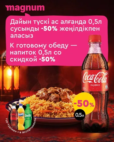 Бұл ұсыныспен түскі ас бұрынғыдан да дәмді болады 🥤 Дайын тамақ сатып алып, 0,5 л Coca-Cola сусынын 50% жеңілдікпен алыңыз! Өзіңіздің мінсіз жұбыңызды таңдаңыз! Акция қазірдің өзінде жүріп жатыр,