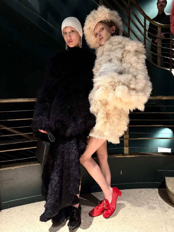 Даша Даниленко (Select Managment) и Вика Вирс (Avant) на бэкстейдже шоу Bottega Veneta. Fun fact: хотя дашин наряд выглядит объемным, его сажали специально по ее фигуре, в ночь перед шоу рукава свитер
