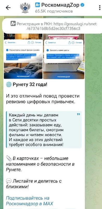 РКН в запрещенной им же "телеге" поздравляет подписчиков с 32-летием убиваемого им Рунета Логика вышла из чата