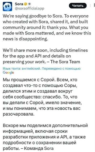 OpenAI прикрыла Sora — самое популярное приложение для нейрослопа накрылось медным тазом. «Всем, кто создавал что-то с помощью Sora, делился этим и создавал вокруг себя сообщество: спасибо. То, что