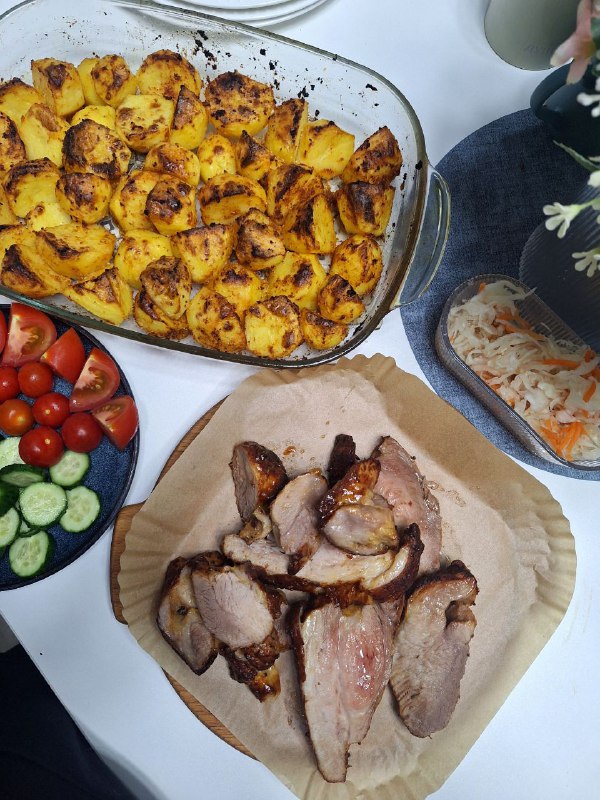 Такой сегодня был ужин🤤 Картошку запекала в духовке, а мясо запекала в своем аэрогриле ( не из сегодняшнего ролика 😄). 🥔Картофель я предварительно отварила, потом сдобрила маслом и специями и з