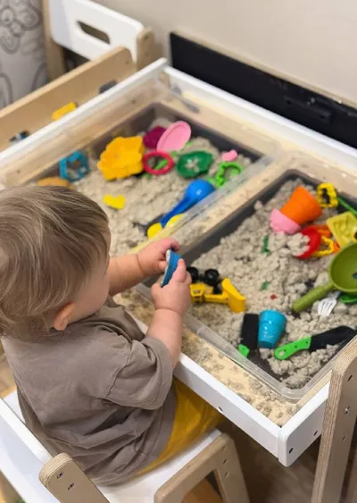 Этот стол одновременно моя радость и боль. В 5 из 10 случаев он занимает Тасю минут на 30, в остальных 5 — доля секунды, в которую она выкидывает весь песок на пол и разносит его носками по всей квар