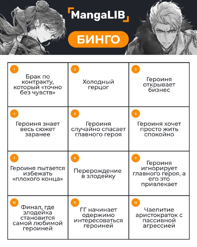 Бинго для тех, кто любит тайтлы про злодеек и попаданок 👑 Контрактный брак, холодный герцог, героиня со знанием сюжета… Кажется, без этого жанр уже просто не существует 😌 Собрали бинго из самых по