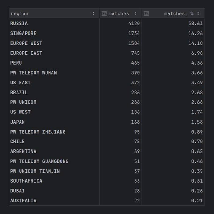 38% всех матчей Доты играется на ру-серверах Сингапур на втором месте по популярности. Данные взяты из анализа случайных 10 000 матчей