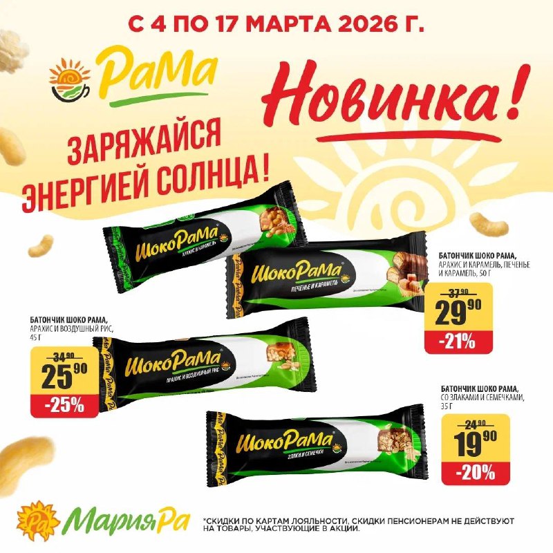 В магазинах Мария-Ра появилась вкусная новинка - батончики ШокоРама ☀️ Лёгкий перекус, который можно взять с собой на работу, учёбу или прогулку. Хрустящие злаки, орехи, карамель, печенье и воздушный