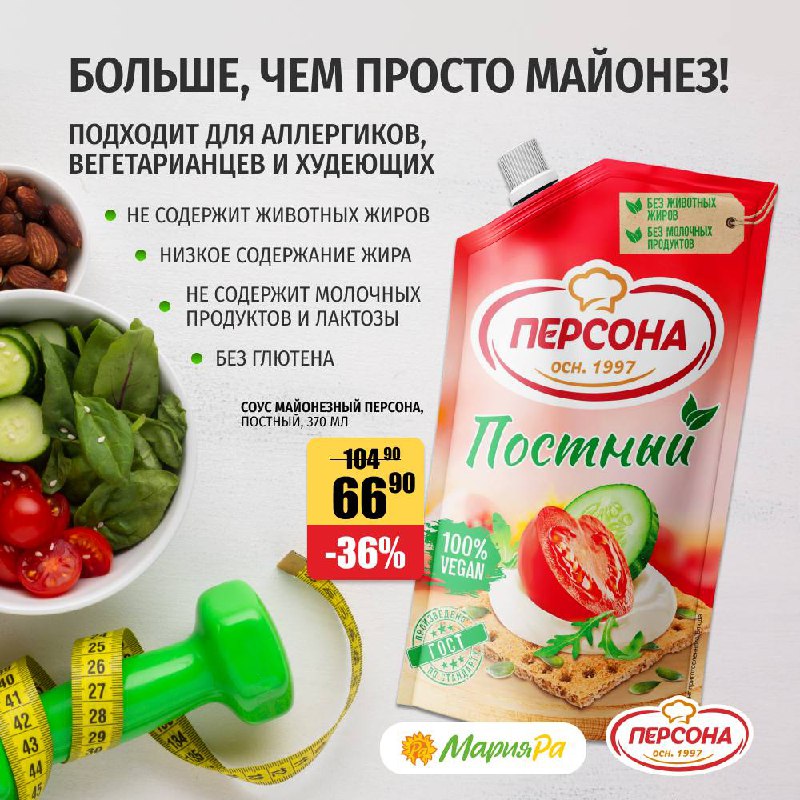 Майонез Персона "Постный" – это идеальный выбор для тех, кто следит за своим питанием и предпочитает здоровый образ жизни Этот классический, низкокалорийный майонезный соус, предлагающий уникальное