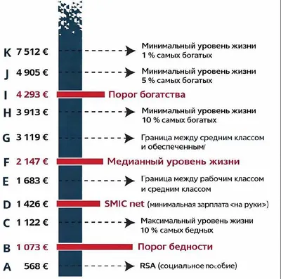 Исследовательский центр Observatoire des inégalités опубликовал данные о доходах во Франции за 2025 год. И, честно говоря, некоторые цифры меня удивили. • Только 1 % людей имеют уровень жизни выше 7