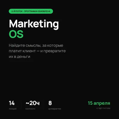 Открываю продажи на второй поток cвоего авторского курса Marketing OS Мягкий старт 15 апреля. Кто был в предзаписи — промокод на 30% уже пришёл в бота, проверяйте. Кто ещё не подписан в предзапись