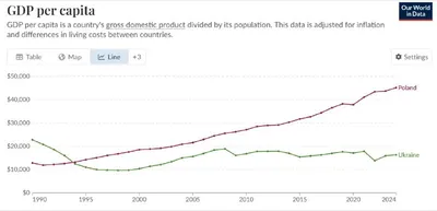 В 1990 году Украина и Польша, как соседние страны отличались в экономическом потенциале, и Польша была отстающей страной. Сейчас это различие осталось, только Польша значительно вырвалась вперёд, и д