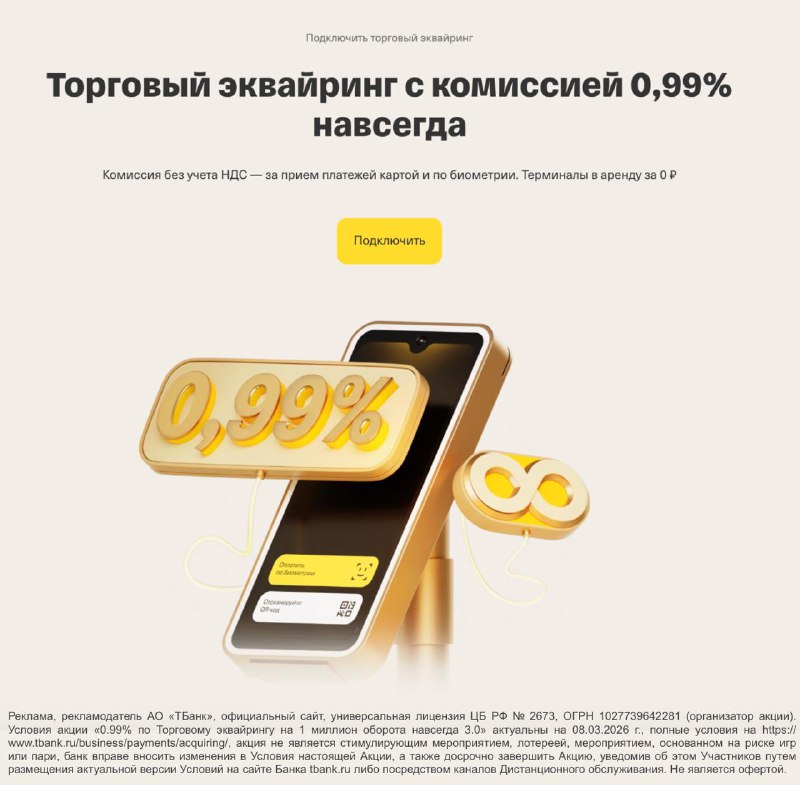 💳 0,99% на торговый эквайринг до 1 млн руб навсегда Т-Банк проводит акцию для новых клиентов ИП и юр. лиц и предлагает всем, у кого на момент подачи заявки в период акции нет расчетного счета, торго