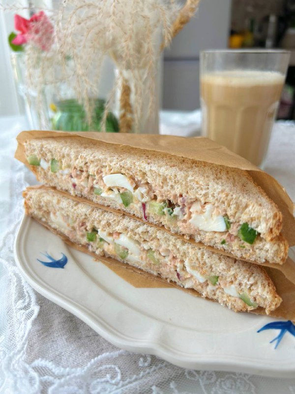Доброе утро, мои хорошие ❤️ Сэндвич с тунцом Выход ~ 1 порция (1 сэндвич) КБЖУ на порцию: 397/22,5/17,1/36,7 Ингредиенты: Хлеб для сэндвичей 80 гр (2 кусочка) Тунец в с/с 50 гр Яйцо С1 1 шт Лук 10 г