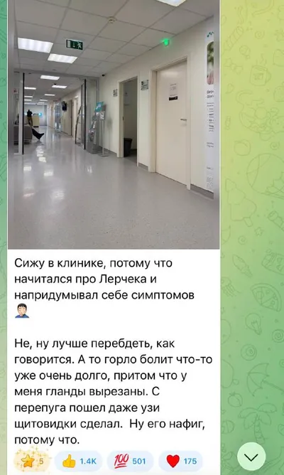 Каждый день в сети вижу посты у блогеров и простых людей, что после новостей про Лерчек они пошли проверятся на онкологию. С одной стороны - может и хорошо, но с другой, психосоматика - вещь тяжелая,