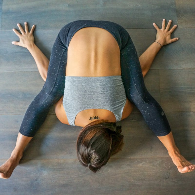 Курмасана: успокаивает дыхание, ум и нервную систему Сядьте на пол и разведите вытянутые ноги на ширину 45–50 см. Согните ноги, стопы подведите к себе и поднимите колени. Выдохните, наклонитесь вперё