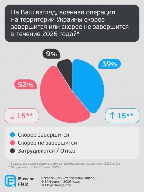 🗣Глас народа. Как россияне относятся к СВО четыре года спустя? Исследовательский центр «Русское поле» провёл всероссийские телефонные опросы 5 - 14 февраля. Респонденты ответили на ряд вопросов на