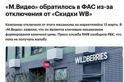 WB отключил СПП для кабинета М.Видео М.Видео обратились в ФАС с жалобой на WB из-за отключения СПП на их кабинете. Тут случилось комбо: • M.Видео делает конкурента WB • И его генеральный директо