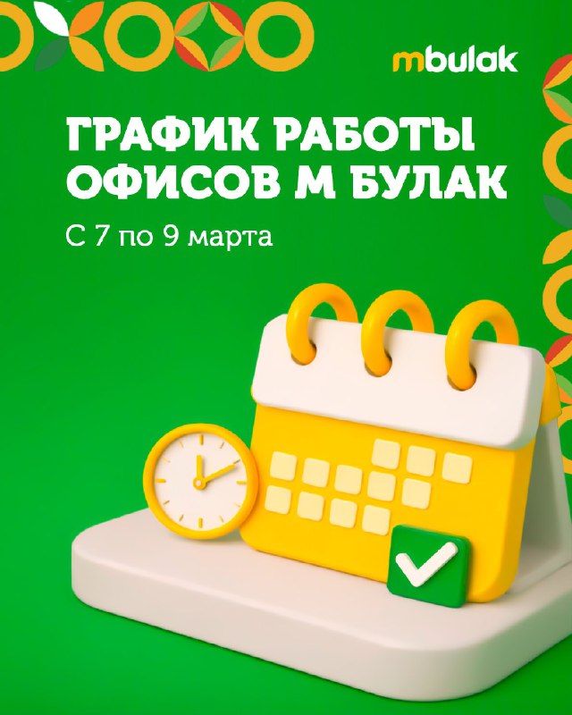 📅 График работы офисов М Булак с 7 по 9 марта Уважаемые клиенты, друзья и партнеры Компании, Поздравляем вас с наступающим Международным женским Днём! 🌸 В праздничные выходные с 7 по 9 марта, граф