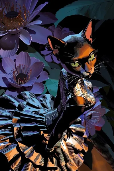 Пушистая антропоморфная черная кошка в облегающем винтажном платье с объемной многослойной юбкой в стиле фламенко, закрывающей большую часть изображения, если смотреть на нее сверху вниз под углом. У