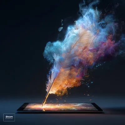 Светящийся цифровой планшет на темной поверхности, с торчащим вверх пером, яркий взрыв красочных «сновидческих» образов, иллюстрация в стиле живописи, чистый фон, вид сбоку, крупный план 🐳 MDJ Schoo