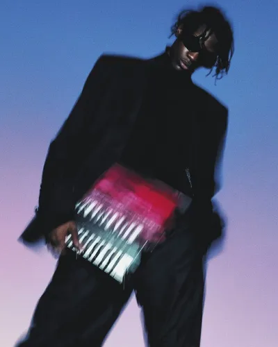 Чернокожий певец, стоящий спиной к спине на фотосессии для билборда, афроамериканский музыкант, играющий на миди-контроллере, запечатлен в размытом движении на пустом синем фоне. Минималистичный и эл