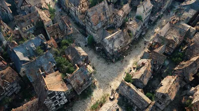 Вид с дрона на улицы маленького городка в ультрареалистичном средневековом фэнтезийном мире 🐳 MDJ School 🐳