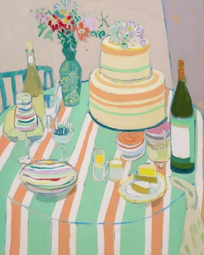 Натюрморт со свадебным тортом на полосатой скатерти в стиле Анри Матисса. Пастельно-зеленые и абрикосовые тона, вазы, бутылка вина, тарелки в полоску и другая посуда. 🐳 MDJ School | Канал в Мах 🐳