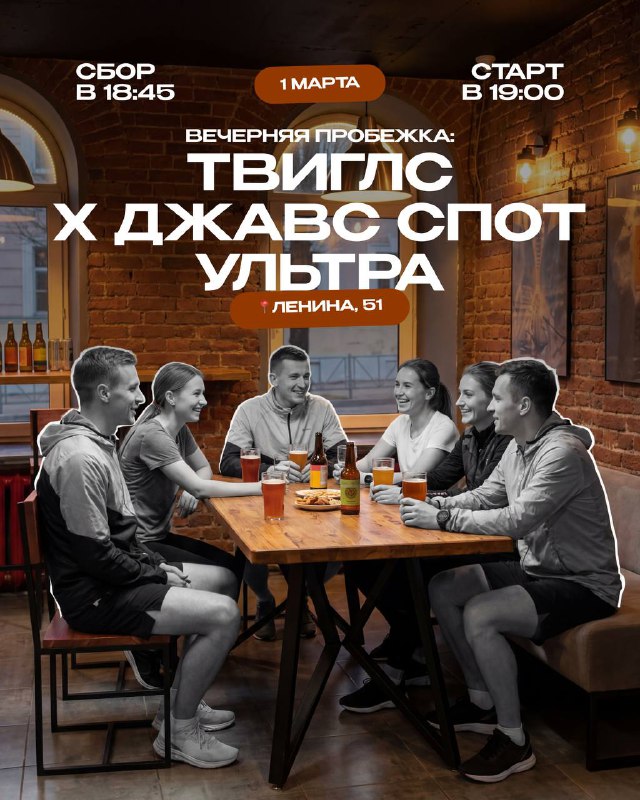 Встречаем начало весны вместе с «Твиглс»🏃🏼♀️ 1 марта приглашаем всех на очередную вечернюю пробежку. Встречаемся в баре «Джавс спот ультра» на улице Ленина. Бежим 5 км с @MamitaVi в темпе 6.30. Н