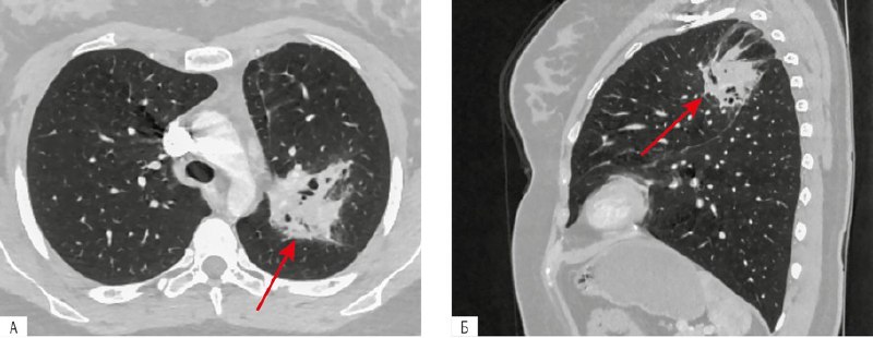 Инфильтрация верхней доли левого легкого с формированием бронхоэктазов (указано стрелкой). Компьютерная томограмма органов грудной клетки в аксиальной (А) и сагиттальной (Б) проекциях