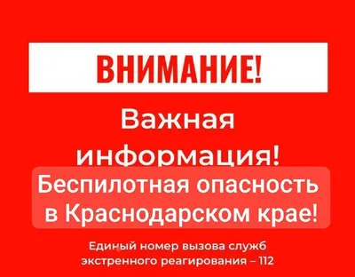 ❗️ВНИМАНИЕ ❗️ 🔴 На территории Краснодарского края ОБЪЯВЛЕНА УГРОЗА атаки беспилотных летательных аппаратов (БПЛА) 🗣️ Если вы находитесь дома: • Не подходите к окнам • Укройтесь в комнате, окна кото