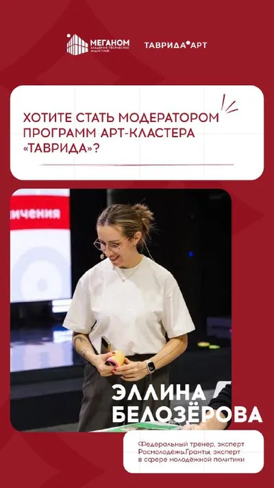Будущие модераторы программ арт-кластера «Таврида», информация для вас ⛔️ Эллина Белозерова, федеральный тренер, эксперт в сфере молодежной политики, эксперт Росмолодёжь.Гранты, рассказала о преимуще