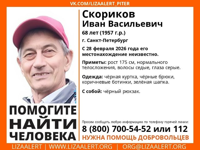 Пропал Скориков Иван Васильевич, 68 лет, г. Санкт-Петербург С 28 февраля 2026 года его местонахождение неизвестно. Приметы: рост 175 см, нормального телосложения, волосы седые, глаза серые. Был оде