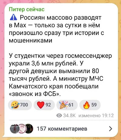 Мошенник похитил у тюменской студентки 3,6 млн рублей в мессенджере Max По данным КоммерсантЪ студентка одного из колледжей Тюменской области лишилась 3,6 млн руб. из-за мошенника в мессенджере Max,