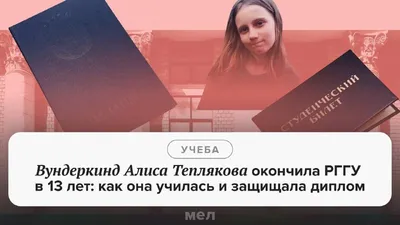 Алиса Теплякова сдала ОГЭ в 7 лет, ЕГЭ — в 8. Через год девочка поступила в МГУ 🎓 Недавно «Мел» писал, что Алиса в 13 лет окончила университет, но не МГУ, а РГГУ на направление «Психолого-педагогиче