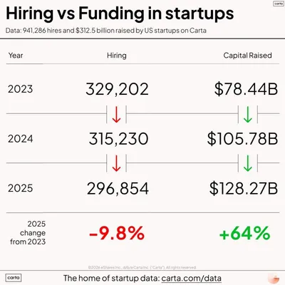 Статистика Carta: стартапы привлекают больше денег, но нанимают меньше людей. 10% это не очень много, но а) это только начало б) реально-то должен бы быть рост, денег-то больше стало. https://www.l