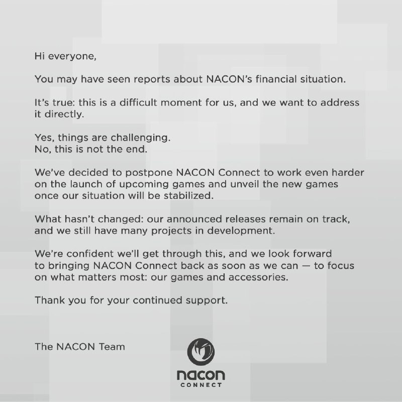 Французский игровой издатель Nacon, который громко заявлял о себе последние пару лет, испытывает финансовые трудности. Всё настолько плохо, что компания перенесла презентацию своих игр с этой недели н