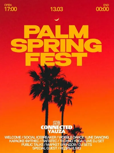 Palm Springs Fest в Yauza В пространстве Yauza Place пройдёт атмосферный Palm Springs Fest — вечер музыки, танцев и городского лайфстайла, который поможет приблизить ощущение весны. Пока Москва толь