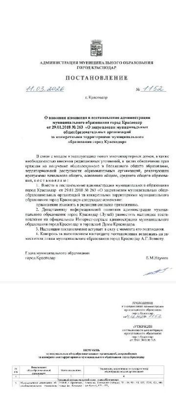 Принято постановление (о внесении изменений от 11.03.2026 ) администрации муниципального образования город Краснодар от 29.01.2018 № 263 "О закреплении муниципальных общеобразовательных организаций за