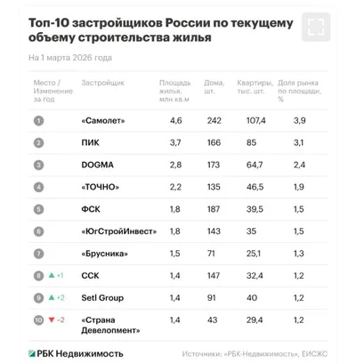 🤩 В рейтинге застройщиков по объёмам строительства произошли изменения: Группа ЛСР выбыла из топ-10, опустившись на 11-е место. Её место в десятке заняла Setl Group. В нижней части рейтинга также наб