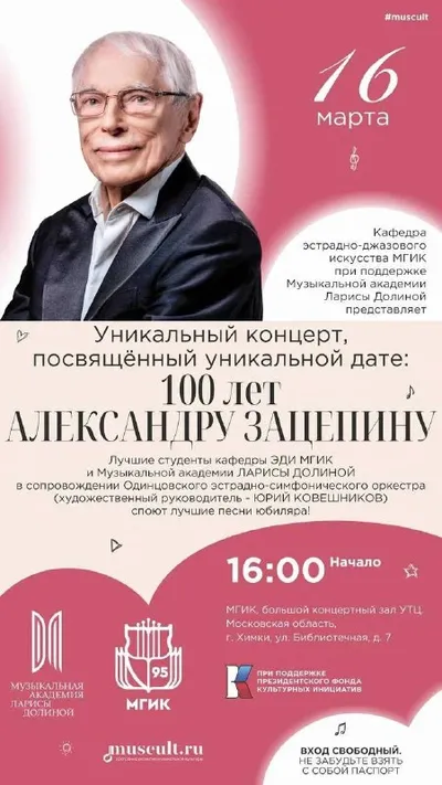 16 марта в МГИК будут играть мелодии, которые знает вся страна 🎶 В большом концертном зале УТЦ пройдет вечер музыки Александра Зацепина. Композитору — 100 лет. «Есть только миг», «Куда уходит детств