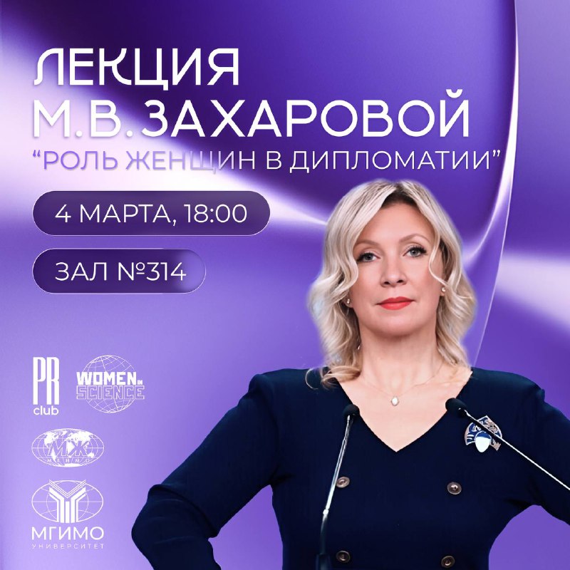 💬Лекция М.В.Захаровой «Роль женщины в дипломатии» 📆 4 марта, 18:00 📍 Зал №2 В рамках проекта «Медиавесна» состоится встреча с официальным представителем МИД России Марией Захаровой. Лекция будет