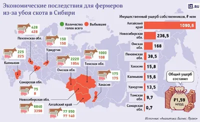 Ущерб фермеров от убоя скота из-за вспышек пастереллеза, бешенства и чумы в феврале-марте оценили в 1,5 млрд рублей. Ещё 368 млн — непокрываемые потери на восстановление стада и карантин. Под убой п