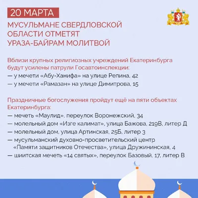 🕌 Мусульмане Свердловской области 20 марта отметят Ураза-байрам — праздник, символизирующий завершение священного месяца Рамадан и окончание поста. Торжественные мероприятия пройдут в 43 оборудован